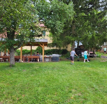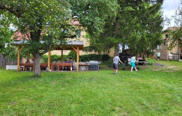 Ve Zbyslavi u řeky Doubravy máme zahradu, která je naším úžasným místem pro práci, odpočinek i zábavu v přírodě. Díky tomuto prostoru můžeme pěstovat vlastní ovoce, zeleninu a bylinky, pečovat o naše vlastní slepičky, využívat venkovní krytou pergolu pro aktivity za každého počasí a pro setkávání s rodinami i přáteli.